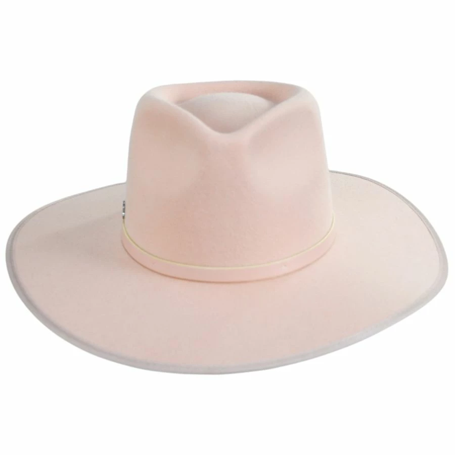 The Vintage Couture Hard Candy Wool Felt Rancher Fedora Hat from Biltmore is a terrific reiteration of a contemporary style. The tall and pronounced teardrop crown has a tonal vegan leather hat band ending with a loop finish at the rear of the crown. Clean lines continue with the tonal grosgrain ribbon binding on the wide brim. This bold shape mellows with the soft blush color, a combination of characteristics that you’ll only see in the Hard Candy Wool Felt Rancher Fedora Hat.
