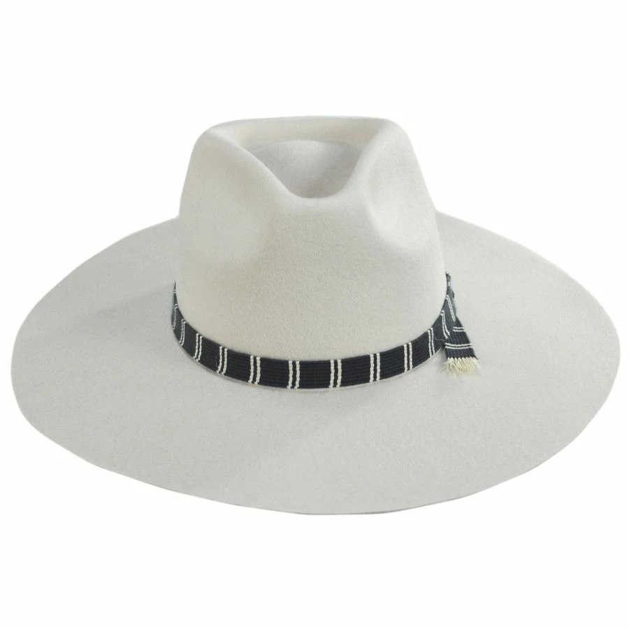Made from 100% cruetly-free wool, the Leigh Wool Felt Wide Brim Fedora Hat – Off White by Brixton Hats is the perfect blend of sophistication and class. The teardrop crown balances with the stiff, flat brim while the pattern woven cotton hat band is all about making a statement. Pair with your favorite outfit to add just the right polish.