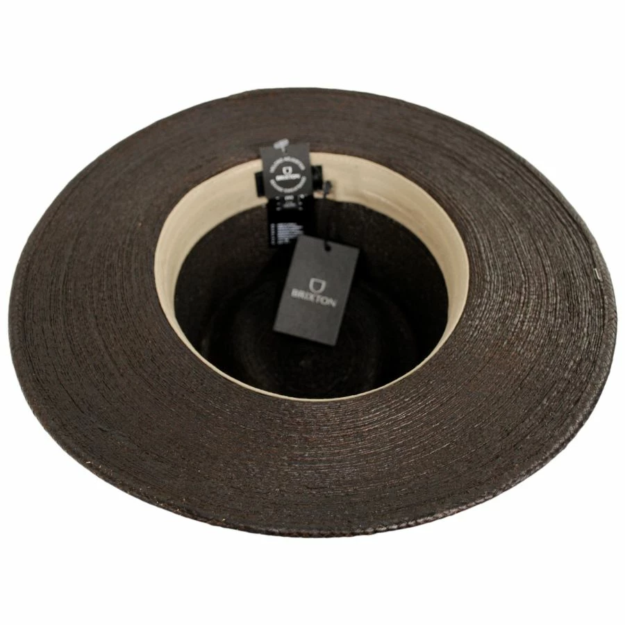 The Marcos Palm Straw Fedora Hat by Brixton Hats is a stylish hat made in Mexico of 100% palm straw in a luxurious dark brown color. The minimalist Marcos sports only a simple Brixton metal side bar and cotton poplin sweatband. No fuss, and will go with just about anything!