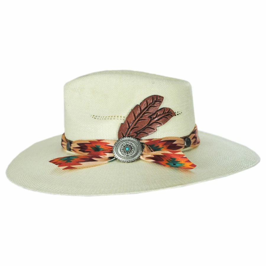 The Tribal Shantung Straw Fedora Hat from Charlie 1 Horse is full of color and is a celebration of well-made straw hats. Made in Mexico of 100% shantung straw, this fedora’s layered hat band steals the show. Double layered with a faux leather bottom layer and a satin tribal patterned scarf on top adorned with metal accent pieces and a leather tooled feather. The beautiful craftsmanship is also demonstrated in the stiff body and tightly woven straw.
