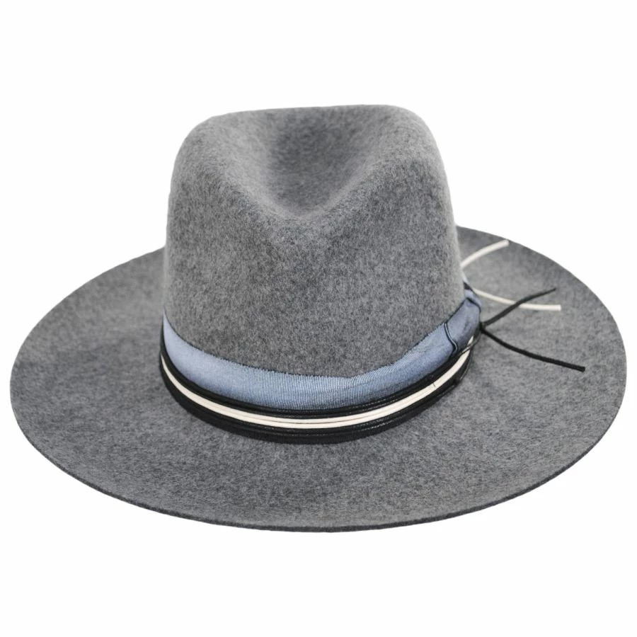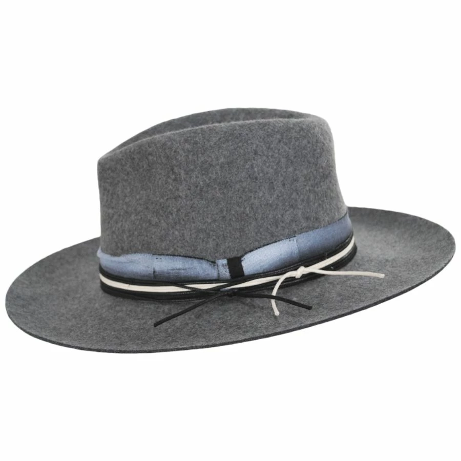 A striking fedora expertly designed by Goorin Bros, the Langum Wool Felt Wide Brim Fedora Hat! An ombre grosgrain ribbon adorns the crown which is layered with a both black and white cord, neatly tied with attractive tails.