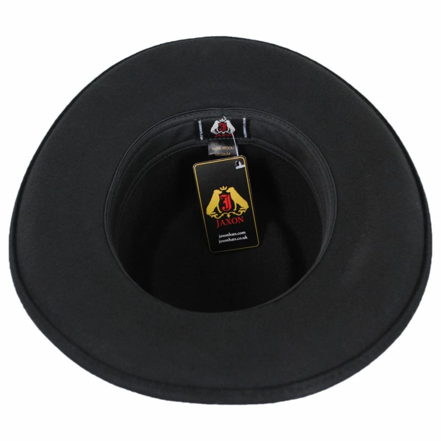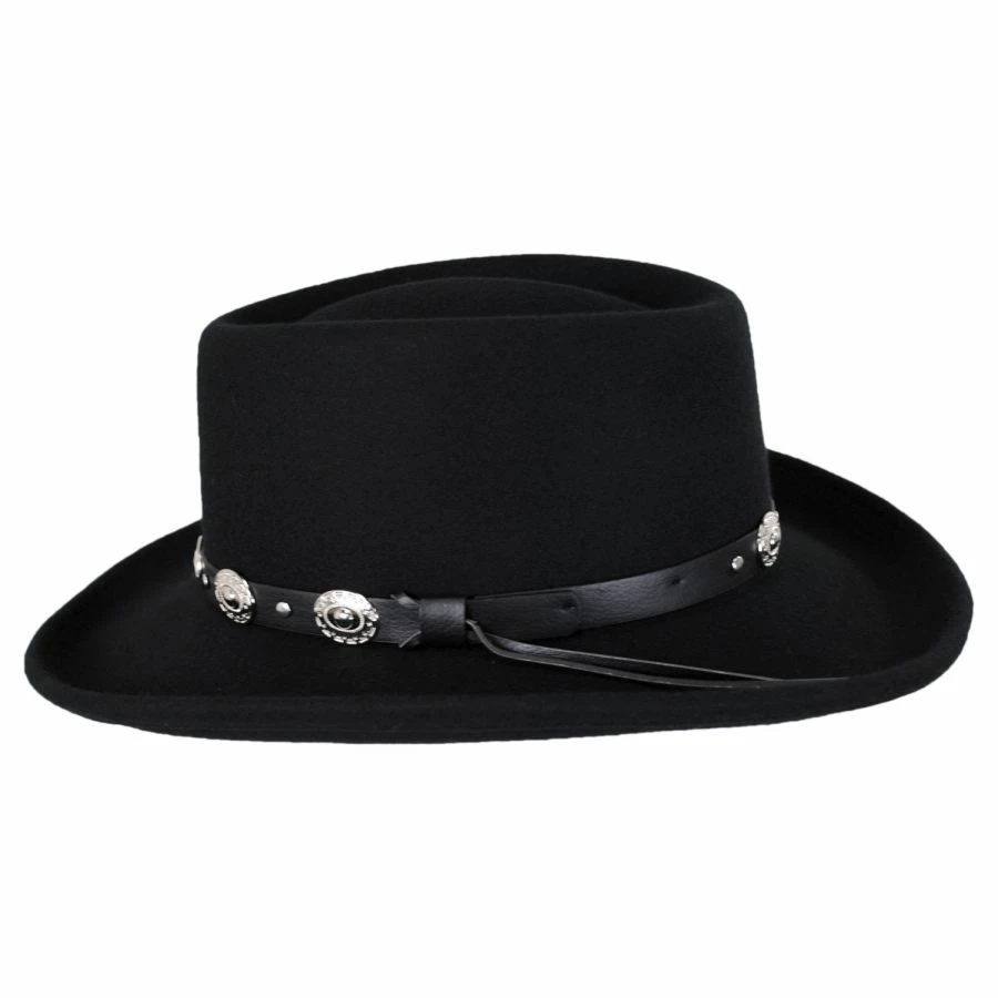 Looking for a gambler at an affordable price…the Crossfire Wool Felt Gambler Hat has been thoughtfully designed by Jaxon Hats to bring you a low-cost option of this popular hat shape. Packable/crushable and made of 100% wool, the Crossfire is adorned with a faux leather hat band. Silver metallic concho accents add flair and distinction while the simple unlined interior with cotton twill sweatband adds comfort and ease for the wearer.