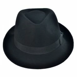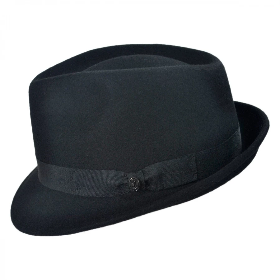 A classic teardrop crown is paired with a modern, pre-snapped stingy brim in the Detroit Wool Trilby Fedora by Jaxon Hats. Made of soft, crushable wool felt, the Detroit Wool Trilby Fedora makes a great travel hat. Complete with a grosgrain ribbon hat band, side feather and Jaxon side pin, the Detroit Wool Trilby Fedora by Jaxon Hats is a fantastic contemporary interpretation of our classic C-Crown Fedora.