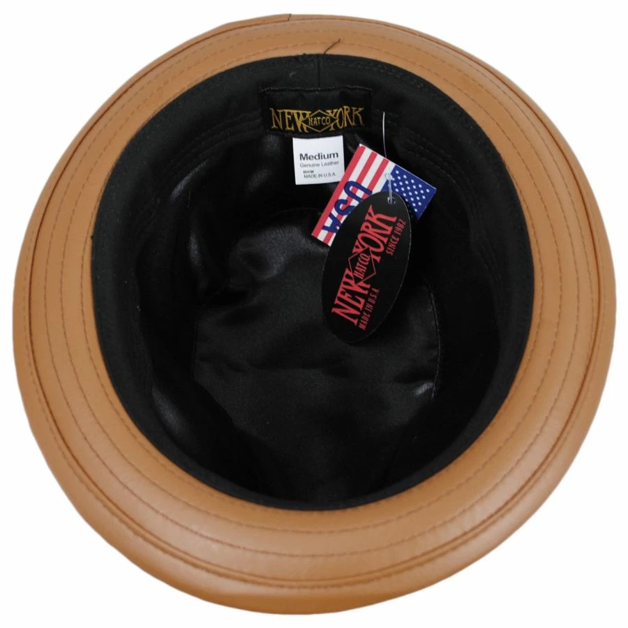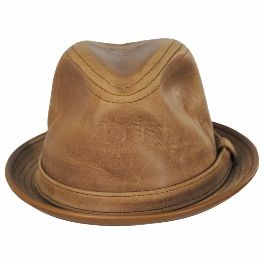 New York Hat Company’s Vintage Leather Fedora Hat is a unique stingy brim fedora made of 100% leather with a slightly vintage finish. The snap brim is bound in a slightly darker toned leather. Even the hat band is leather! The only none leather in sight is the cotton twill sweatband and satin lining.