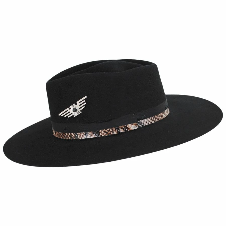 Renegade introduces a new shape with the Ember Wool Felt Cross Crown Rancher Hat. The Renegade cross crown is identical to a diamond crown, which creates a low profile crown. This unique crown sits atop a flat wide brim that helps to showcase the hand distressed grosgrain ribbon hat band with a colorful leather overlay. The firebird accent pin compliments the textures and hues of the double layer hat band.