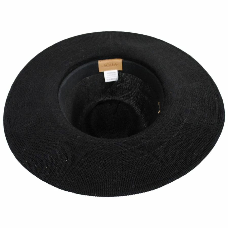 Scala’s Delvey Knit Fedora Hat is a packable hat made of a cotton blend knit, blocked into a wide brim fedora. Adorned with a multi-layered grosgrain ribbon hat band, accented with a delicate metallic chain. For added drama, frayed straw accent pieces have been strategically placed around the crown.
