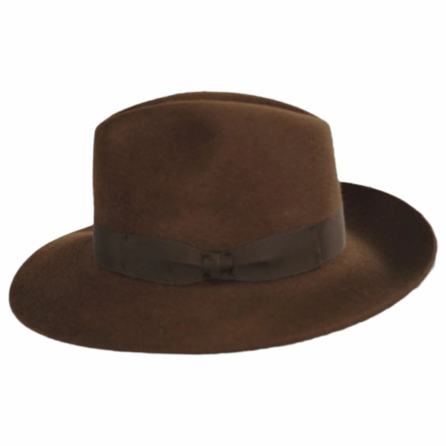 Take a step to the next level of class with the Buck Fur Felt Wide Brim Fedora Hat from Stefeno. This sharp fedora is made in Spain and features a glorious fur felt body, with a grosgrain ribbon hat band wrapping around the crown. Additionally, to optimize comfort, the interior is lined with smooth satin.