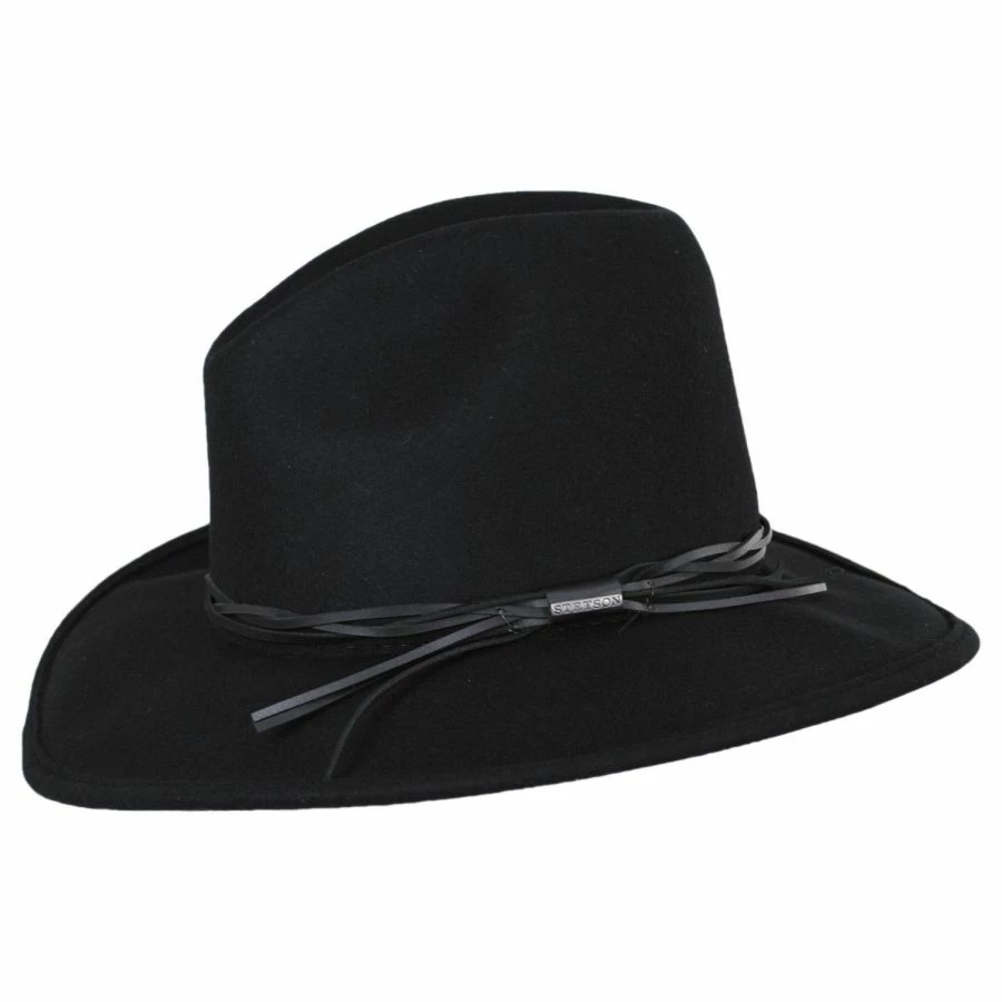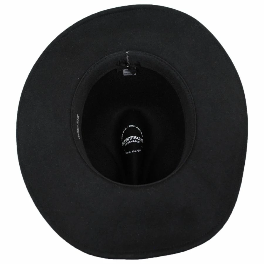 Full of character and charm thanks to its unique silhouette, the Gus Crushable Wool Felt Western Hat by Stetson features a gus crown and multi-layered leather hat band with little accents such as tassels and a Stetson metal side pin. The curved overwelt brim adds a touch of flair to the Gus. Also practical thanks to the DRI-LEX® sweatband and unlined interior.