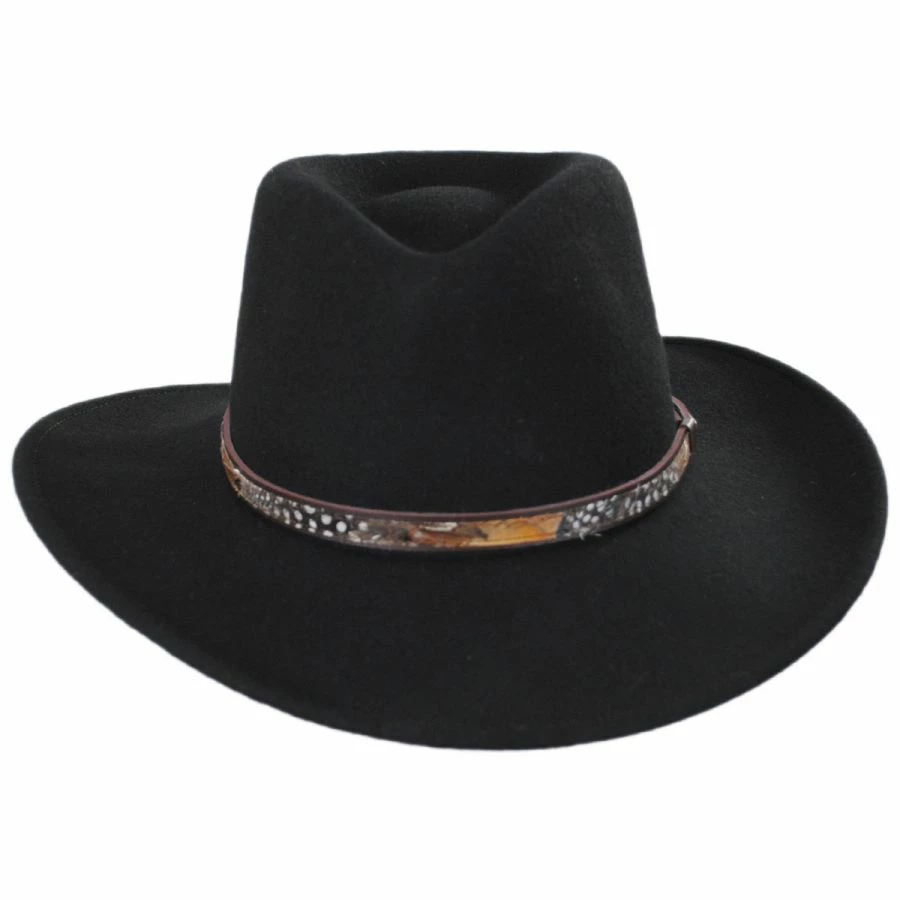 The epitome of true American craftsmanship is seen beautifully with the Linwood Crushable Wool Felt Outback Hat from Stetson. The faux leather hat band features pressed feathers, as well as a metallic Stetson label. Durable and comfortable, the Linwood is the perfect hat for any adventurer.
